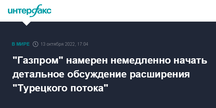 Москва. 13 октября. INTERFAX.RU - Детальное обсуждение расширения газопроводной системы "Турецкий поток" и создания газового хаба в Турции начнется незамедлительно, заявил в эфире Первого канала председатель правления "Газпрома" Алексей Миллер.