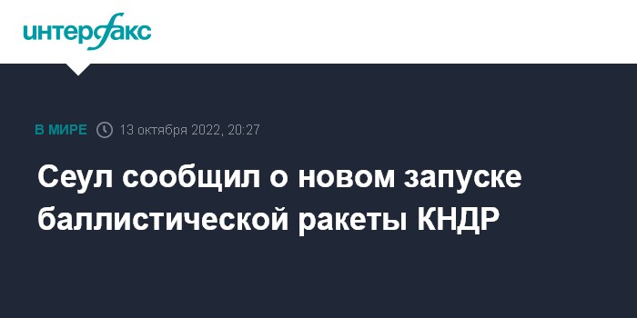Москва. 13 октября. INTERFAX.RU - Северокорейские военные запустили баллистическую ракету в направлении к Японскому морю, сообщает "Рёнхап" со ссылкой на Объединенный комитет начальников штабов Южной Кореи. Характеристики этой ракеты не уточняются.