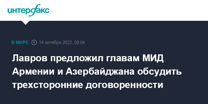 Москва. 14 октября. INTERFAX.RU - Глава МИД РФ Сергей Лавров рассчитывает в ходе встречи с коллегами из Армении и Азербайджана обсудить реализацию трехсторонних договоренностей президентов двух стран от 2020 и 2021 года, чтобы понять, "как двигаться дальше".