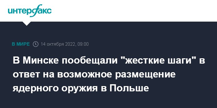 Москва. 14 октября. INTERFAX.RU - Белоруссия намерена предпринять "жесткие шаги" в случае размещения ядерного оружия в Польше или любых других соседних странах, заявил глава МИД Белоруссии Владимир Макей.