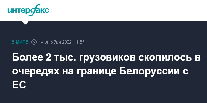 Москва. 14 октября. INTERFAX.RU - Более 2 тысяч грузовых фур и 300 легковых автомобилей скопилось в очередях на границе на выезд из Белоруссии в Евросоюз, сообщил в пятницу Госпогранкомитет Белоруссии.