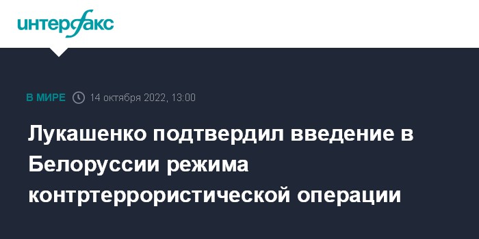 Москва. 14 октября. INTERFAX.RU - В Белоруссии введен режим контртеррористической операции (КТО) в связи с обострением ситуации и начаты процедуры, связанные с развертыванием союзной группировки войск, заявил глава государства Александр Лукашенко.