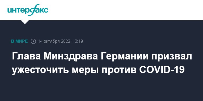 Москва. 14 октября. INTERFAX.RU - Министр здравоохранения Германии Карл Лаутербах высказал обеспокоенность ситуацией с коронавирусомв стране, призвав ужесточить меры против распространения заболевания, сообщает в пятницу Associated Press.