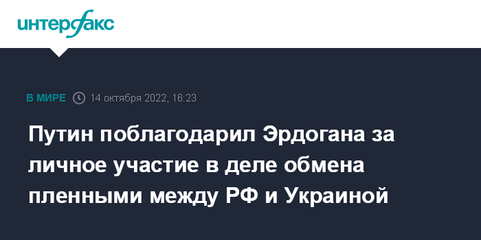 Москва. 14 октября. INTERFAX.RU - Президент Турции Реджеп Тайип Эрдоган лично участвовал в деле обмена пленными между Россией и Украиной, заявил российский лидер Владимир Путин.