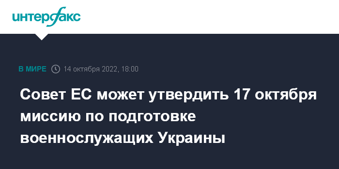 Москва. 14 октября. INTERFAX.RU - На заседании Совета ЕС по иностранным делам в понедельник, 17 октября, в Люксембурге ожидается принятие решения о миссии Евросоюза по подготовке украинских военнослужащих, заявил журналистам высокопоставленный европейский чиновник на условиях анонимности.