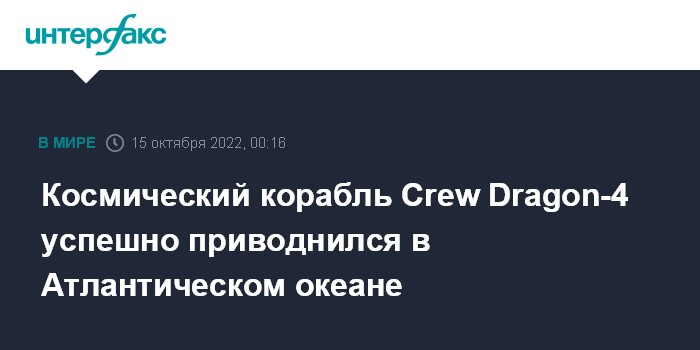 Москва. 15 октября. INTERFAX.RU - Американский пилотируемый космический корабль Crew Dragon-4 компании SpaceX с четырьмя астронавтами на борту успешно приводнился в Атлантике у берегов штата Флорида, в пятницу покинув Международную космическую станцию (МКС), сообщило Национальное управления США по аэронавтике и исследованию космического пространства (NASA).
