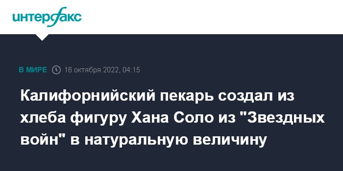 Москва. 16 октября. INTERFAX.RU - Пекарня в районе залива Сан-Франциско показала свою хлебную скульптуру персонажа "Звездных войн", который появился после замораживания в карбоните в фильме "Империя наносит ответный удар". Хлебная статуя имеет высоту 1,8 м. Об этом сообщает Associated Press.