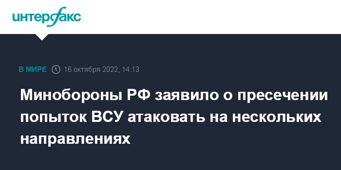 Москва. 16 октября. INTERFAX.RU - Пресечены попытки армии Украины атаковать на Купянском, Краснолиманском, Запорожском, Криворожском, Андреевском и Николаевском направлениях, заявили в Минобороны РФ.