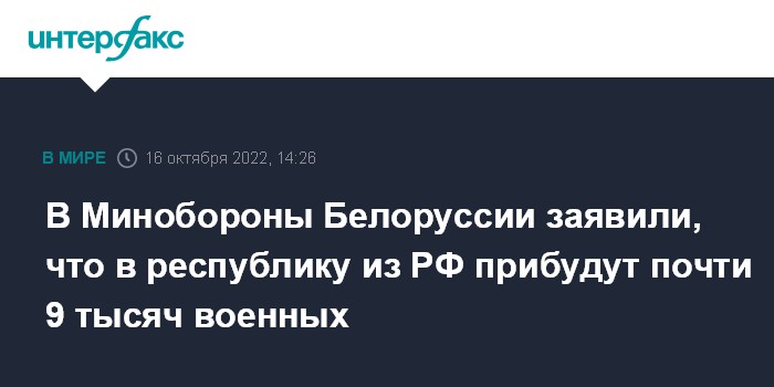 Москва. 16 октября. INTERFAX.RU - Около девяти тысяч российских военнослужащих прибудут в Белоруссию в рамках развертывания совместной группировки войск, сообщили в Минобороны республики.