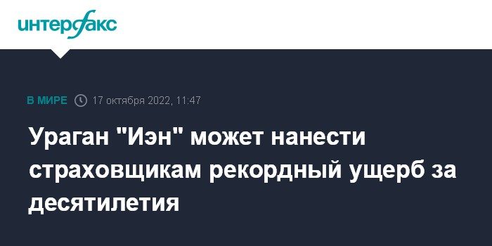 Москва. 17 октября. INTERFAX.RU - Страховые убытки от урагана "Иэн", обрушившегося на побережье Соединенных Штатов в конце сентября, могут достичь $75 млрд. Об этом пишет Financial Times со ссылкой на предварительные оценки экспертов.