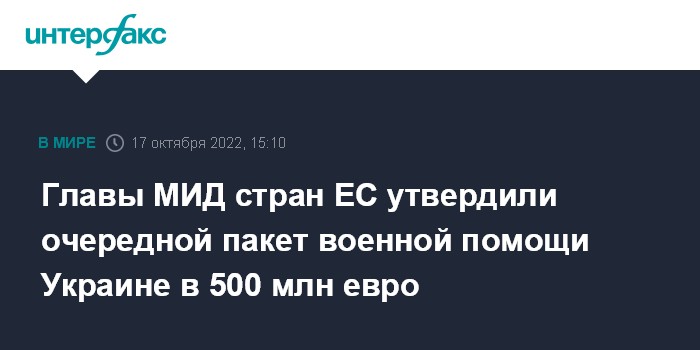 Москва. 17 октября. INTERFAX.RU - Совет ЕС по иностранным делам в понедельник на заседании в Люксембурге принял решение о выделении Украине очередного транша военной помощи Евросоюза в 500 млн евро.