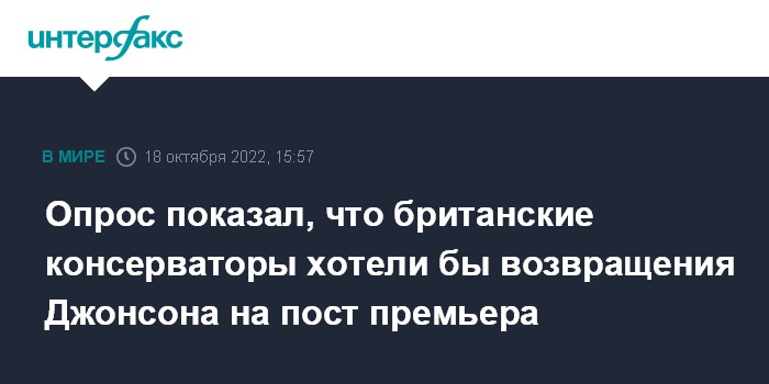 Москва. 18 октября. INTERFAX.RU - В Консервативной партии Великобритании считают, что нынешний премьер-министр страны Лиз Трасс не соответствует занимаемой должности, и хотели бы возвращения Бориса Джонсона - таковы данные опроса, проведенного службой изучения общественного мнения YouGov.