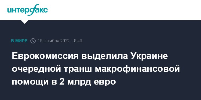 Москва. 18 октября. INTERFAX.RU - Еврокомиссия (ЕК) объявила во вторник о выделении первого транша в размере 2 млрд евро в рамках операции исключительной макрофинансовой помощи Украине в размере 5 млрд евро.