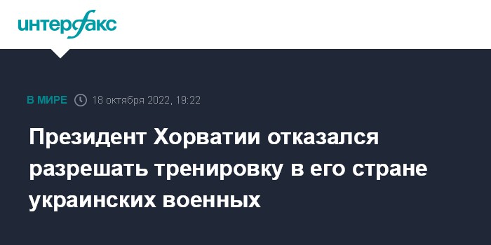 Москва. 18 октября. INTERFAX.RU - Президент Хорватии Зоран Миланович заявил во вторник, что не допустит организацию подготовки украинских военных на территории его страны.