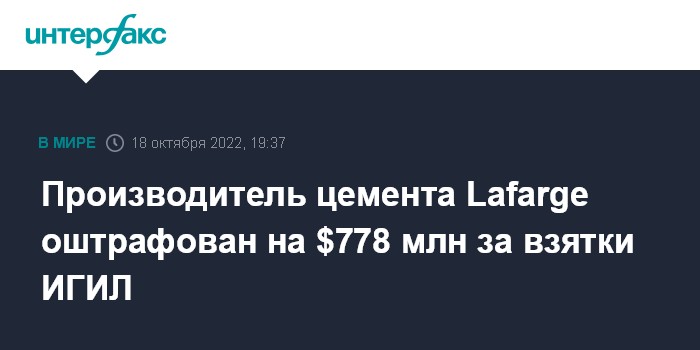 Москва. 18 октября. INTERFAX.RU - Французская компания Lafarge SA признала факт уплаты денег террористической группировке ИГИЛ (запрещена в РФ) и другим вооруженным формированиям для поддержания работы своего завода по производству цемента в Сирии и была оштрафована на $778 млн.