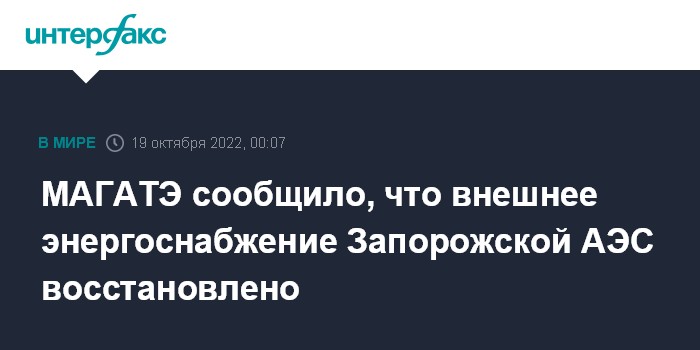 Москва. 19 октября. INTERFAX.RU - Энергоснабжение Запорожской АЭС по внешней линии восстановлено, говорится во вторник в заявлении главы МАГАТЭ Рафаэля Гросси.