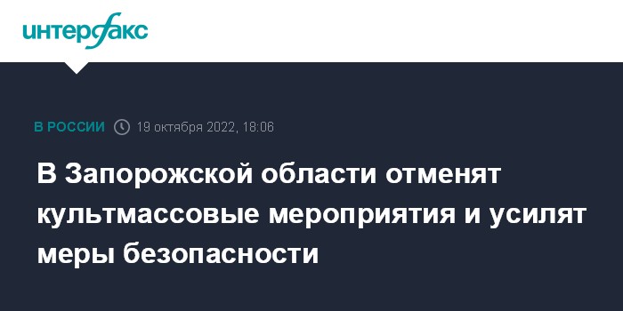 Москва. 19 октября. INTERFAX.RU - Врио губернатора Запорожской области Евгений Балицкий объявил, что в связи со введением в регионе военного положения там будут усилены меры безопасности. В частности, там отменят культурно-массовые мероприятия, сообщил он в Telegram.
