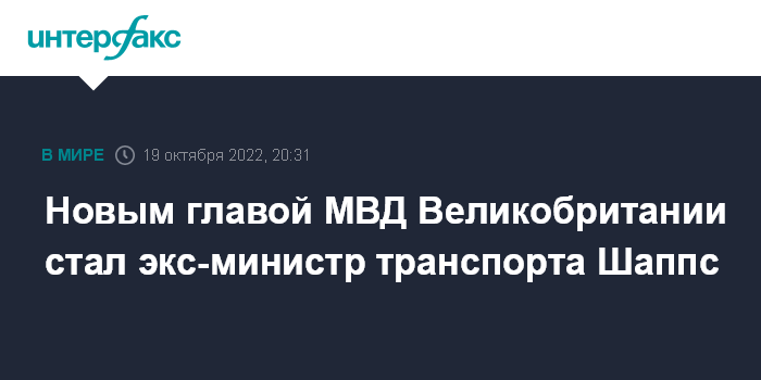 Москва. 19 октября. INTERFAX.RU - Бывший министр транспорта Грант Шаппс назначен новым главой МВД Великобритании, сообщает правительство королевства.