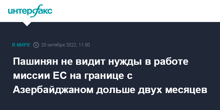 Москва. 20 октября. INTERFAX.RU - Премьер-министр Армении Никол Пашинян не уверен в необходимости продления работы двухмесячной наблюдательной миссии Евросоюза на армяно-азербайджанской границе.