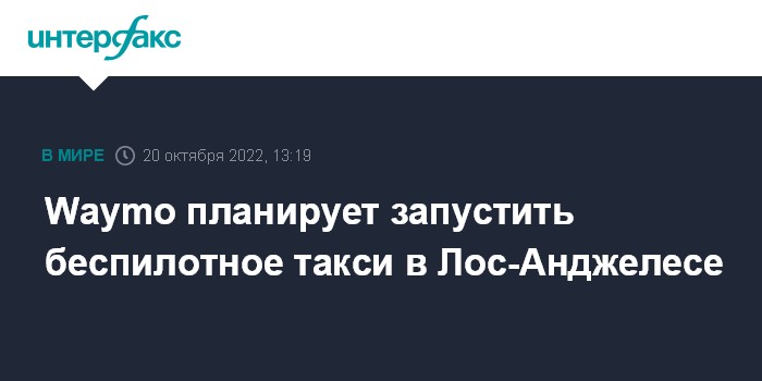 Москва. 20 октября. INTERFAX.RU - Американская компания Waymo, входящая в группу Alphabet и специализирующаяся на беспилотных автомобилях, планирует запустить сервис беспилотного такси в Лос-Анджелесе.
