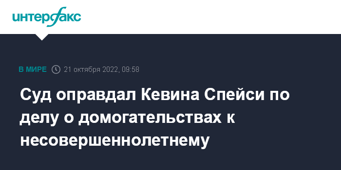 Москва. 21 октября. INTERFAX.RU - Суд Манхэттена оправдал актера Кевина Спейси по делу о домогательствах в 1986 году к Энтони Рэппу, которому на тот момент было 14 лет, передает CNN. Присяжные сочли, что истец не смог доказать, что актер тогда применил к нему силу (battery) и его домогался.