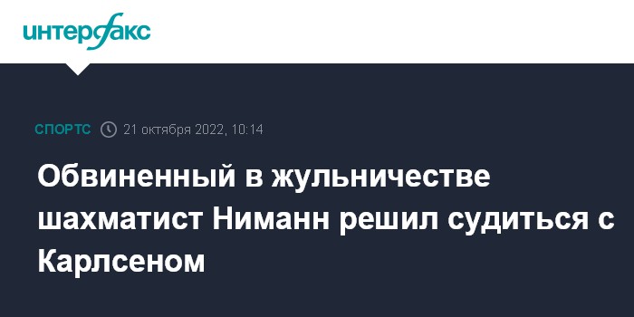 Москва. 21 октября. INTERFAX.RU - Американский гроссмейстер Ханс Ниманн, которого норвежец Магнус Карлсен недавно публично обвинил в мошенничестве, подал в суд на него и на издание Chess.com, обвинив их в клевете.