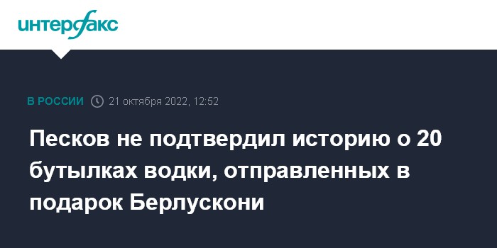 Москва. 21 октября. INTERFAX.RU - Пресс-секретарь президента Дмитрий Песков не смог подтвердить информацию итальянских СМИ о том, что Владимир Путин якобы отправил экс-премьеру Италии Сильвио Берлускони на день рождения ящик водки.