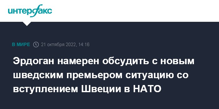Москва. 21 октября. INTERFAX.RU - Президент Турции Реджеп Тайип Эрдоган встретится с новым шведским премьер-министром Ульфом Кристерссоном, чтобы обсудить заявку Стокгольма на членство в НАТО, сообщает в пятницу "Анадолу".