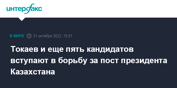 Таким образом, в борьбу за пост президента вступают шесть кандидатов, зарегистрированных ЦИК: действующий президент Казахстана Касым-Жомарт Токаев (выдвинут народной коалицией общественно-политических сил); Нурлан Ауесбаев (кандидат от оппозиционной Общенациональной социал-демократической партии (ОСДП)); Мейрам Кажыкен (от республиканского объединения "Содружество профсоюзов Казахстана "Аманат"); Жигули Дайрабаев (от народно-демократической патриотической партии "Ауыл"); Каракат Абден (от альянса соцработников); Салтанат Турсынбекова (от общественного объединения "Казак аналары - дестурге жол" ("Казахские матери - путь к обычаям")).
