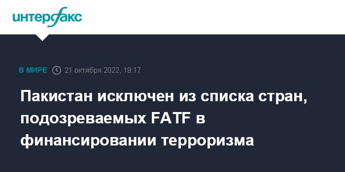 Москва. 21 октября. INTERFAX.RU - Группа по разработке финансовых мер по борьбе с отмыванием денег (FATF) убрала Пакистан из так называемого "серого списка" стран, которые подозреваются в финансировании терроризма, сообщает Bloomberg.