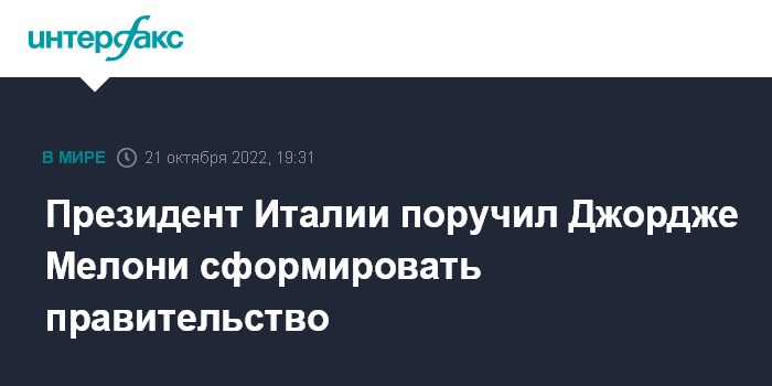Москва. 21 октября. INTERFAX.RU - Президент Италии Серджо Маттарелла поручил лидеру правой партии "Братья Италии" Джордже Мелони сформировать правительство, сообщил журналистам представитель канцелярии главы государства Уго Дзампетти.