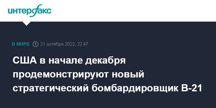 Москва. 21 октября. INTERFAX.RU - Новый американский стратегический бомбардировщик B-21 Raider, создаваемый корпорацией Northrop Grumman, будет представлен 2 декабря в ходе церемонии на заводе в городе Палмдейл (штат Калифорния), сообщило Командование глобальных ударов ВВС ВС США.