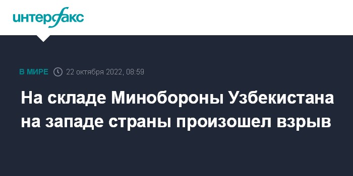 Москва. 22 октября. INTERFAX.RU - Взрыв произошел на складе министерства обороны Узбекистана в Сырдарьинской области (запад страны - ИФ), жертв и пострадавших нет, сообщила в субботу пресс-служба оборонного ведомства республики.