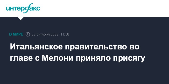 Москва. 22 октября. INTERFAX.RU - Церемония приведения к присяге правительства Италии, сформированного премьером Джорджей Мелони, прошла утром в субботу в Квиринальском дворце в Риме в присутствии президента страны Серджо Маттареллы, сообщает телеканал RAI.
