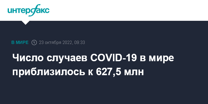 Москва. 23 октября. INTERFAX.RU - Число подтвержденных случаев заражения коронавирусом в мире на утро воскресенья достигло 627,47 млн, свидетельствуют данные американского университета Джонса Хопкинса.