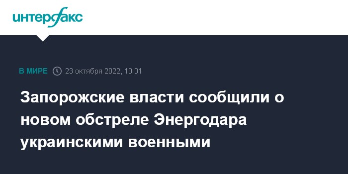 Москва. 23 октября. INTERFAX.RU - Украинские военные открыли артиллерийский огонь по городу Энергодар в Запорожской области, зафиксированы удары по гостинице и въезду в город, сообщил в воскресенье член главного совета администрации региона, председатель движения "Мы вместе с Россией" Владимир Рогов.