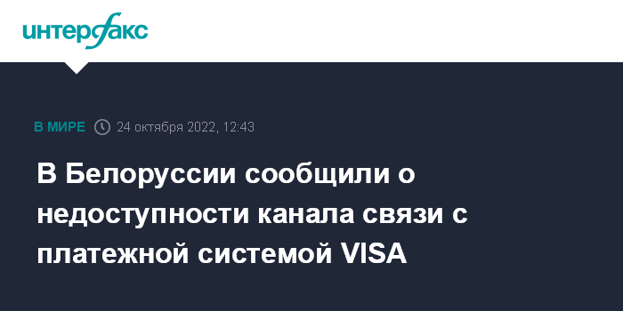 Москва. 24 октября. INTERFAX.RU - В Белоруссии в понедельник выявлены проблемы с доступом к каналу связи с международной платежной системой VISA.
