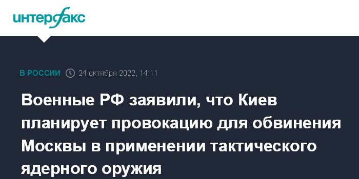 Москва. 24 октября. INTERFAX.RU - Российские военные заявили, что у них есть информация о планах Киева организовать провокацию с применением "грязной бомбы" или маломощного ядерного боеприпаса.