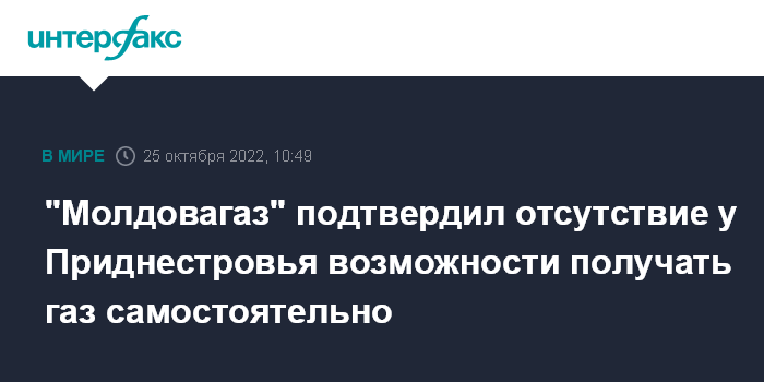 Москва. 25 октября. INTERFAX.RU - Обеспечить прямые поставки газа в Приднестровский регион на сегодняшний день невозможно, написал председатель правления АО "Молдовагаз" Вадим Чебан в своем телеграм-канале во вторник.