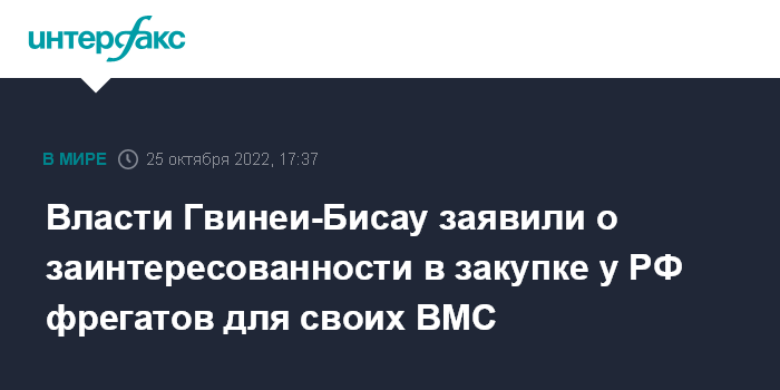 Москва. 25 октября. INTERFAX.RU - Гвинея-Бисау заинтересована в закупках у России фрегатов для своих Военно-морских сил, заявил президент республики Умару Сиссоку Эмбало.