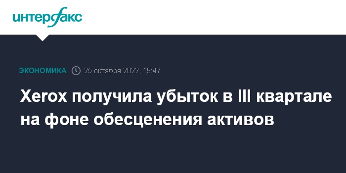 Москва. 25 октября. INTERFAX.RU - Американская Xerox Holdings получила чистый убыток в третьем квартале 2022 года на фоне обесценения активов.