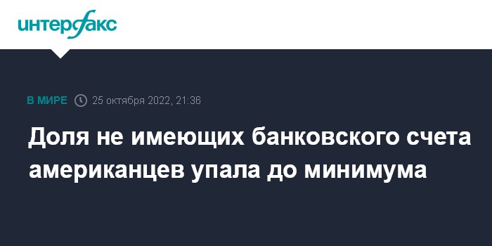 Москва. 25 октября. INTERFAX.RU - Процент домохозяйств США, не имеющих банковского счета, в 2021 году снизился несмотря на вызванные пандемией COVID-19 беспрецедентные экономические трудности. Об этом говорится в публикуемом раз в два года отчете Федеральной корпорации по страхованию депозитов (Federal Deposit Insurance Corporation, FDIC).