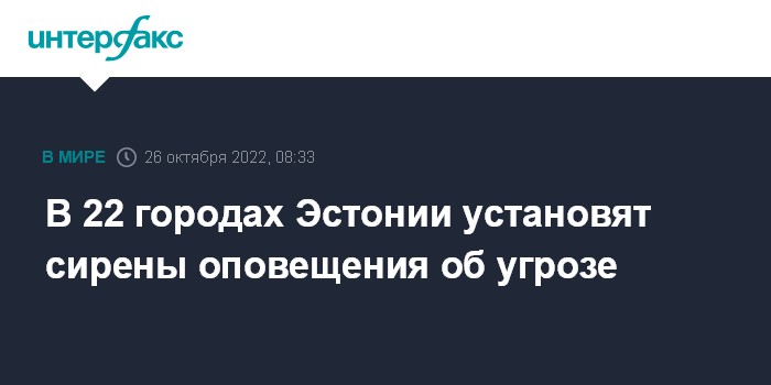 Москва. 26 октября. INTERFAX.RU - В Эстонии решили в 22 городах установить сирены оповещения об угрозе. Договор на покупку сирен центр информационных технологи МВД страны и Спасательный департамент Эстонии заключили со словацкой компанией Telegrafia, передает ERR.