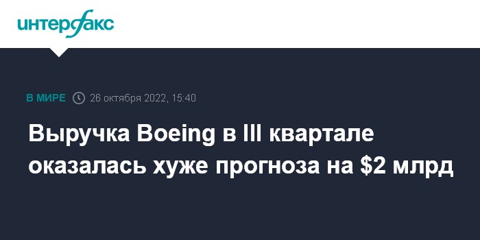 Москва. 26 октября. INTERFAX.RU - Американский концерн Boeing, один из крупнейших мировых производителей авиационной, космической и военной техники, увеличил выручку в третьем квартале 2022 года на 4%, однако показатель оказался хуже среднего прогноза рынка почти на $2 млрд.