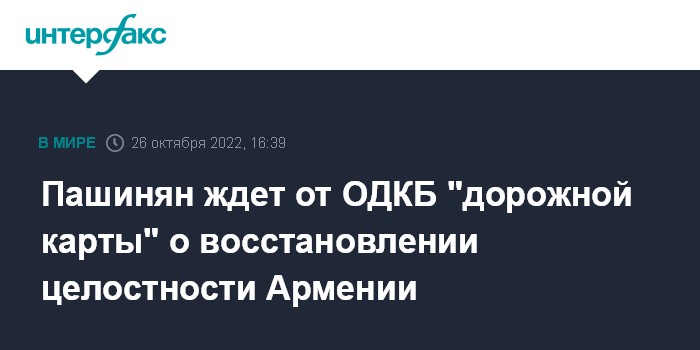 Москва. 26 октября. INTERFAX.RU - Премьер-министр Армении Никол Пашинян ожидает от Совета коллективной безопасности Организации Договора о коллективной безопасности (ОДКБ) принятия "дорожной карты" по восстановлению территориальной целостности республики. Он заявил об этом на парламентском часе.