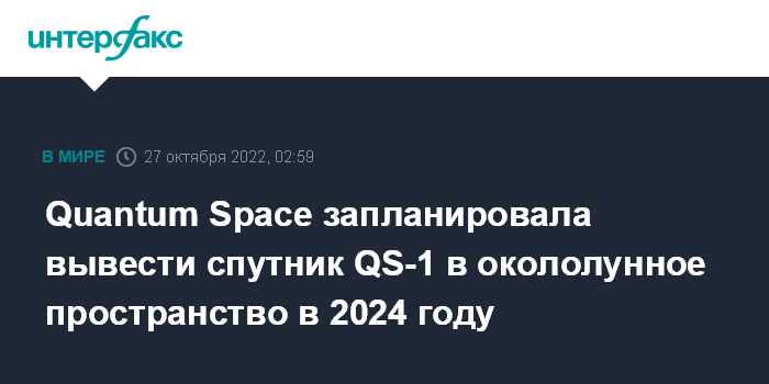 Москва. 27 октября. INTERFAX.RU - Частная аэрокосмическая компания Quantum Space планирует провести коммерческую миссию по выводу спутника QS-1 в окололунное пространство в конце 2024 года, сообщила в среду компания на своем сайте.