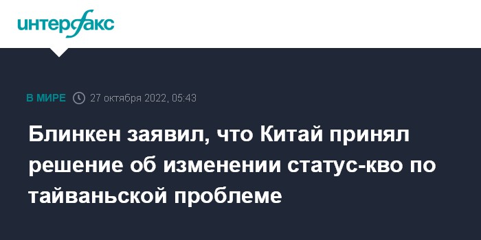 Москва. 27 октября. INTERFAX.RU - Госсекретарь США Энтони Блинкен заявил, что Китай принял решение об изменении статус-кво по тайваньской проблеме.