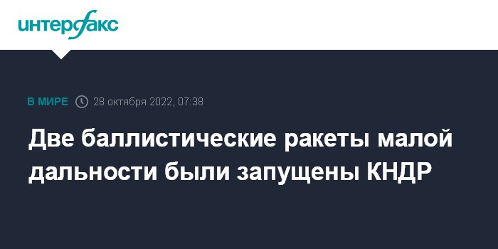 Москва. 28 октября. INTERFAX.RU - Северная Корея в пятницу выпустила две баллистические ракеты малой дальности в сторону Японского моря, сообщили южнокорейские военные уточненную информацию.