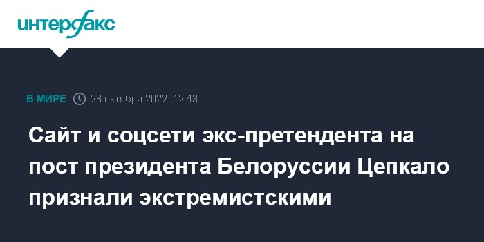 Москва. 28 октября. INTERFAX.RU - Интернет-ресурсы бывшего претендента на пост президента Белоруссии на выборах 2020 года Валерия Цепкало признали экстремистскими.