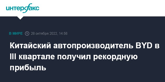 Москва. 28 октября. INTERFAX.RU - Китайская BYD Co Ltd, ведущий производитель автомобилей на новых источниках энергии (NEV) в стране, в третьем квартале 2022 года получила рекордную чистую прибыль из-за скачка продаж в Китае.